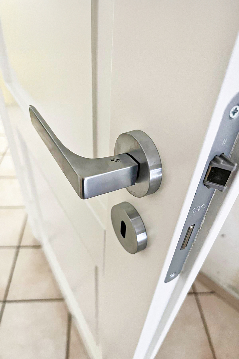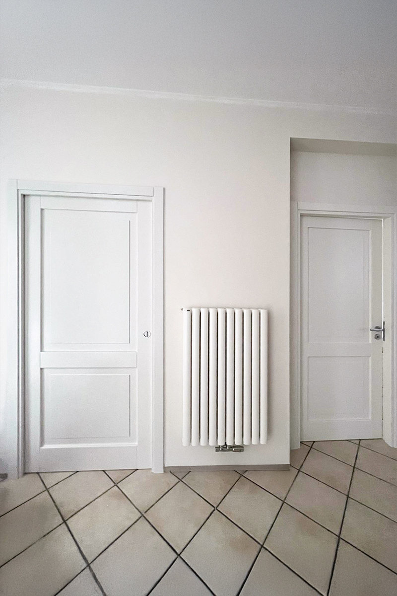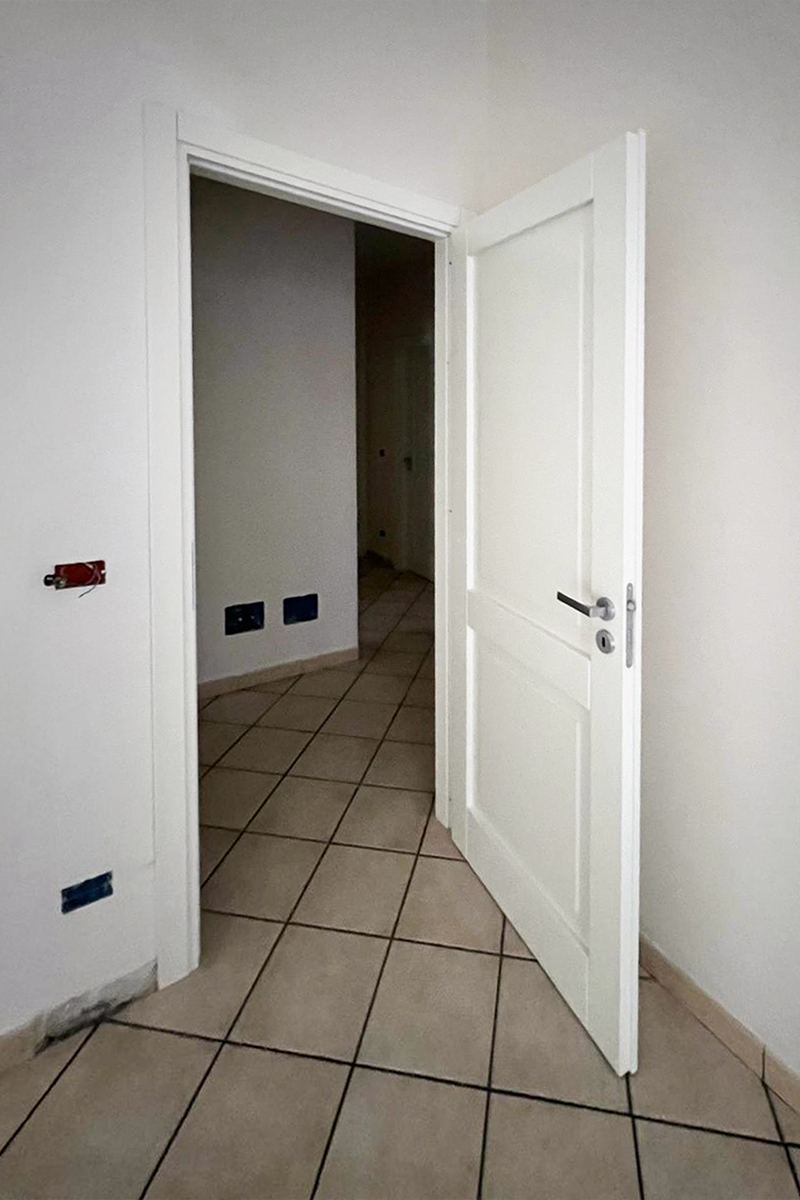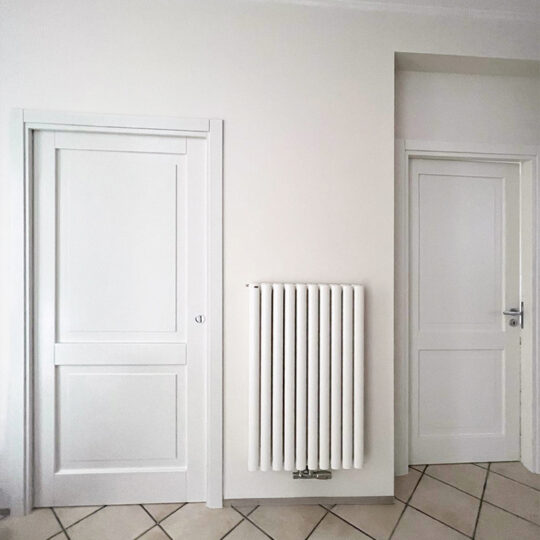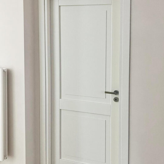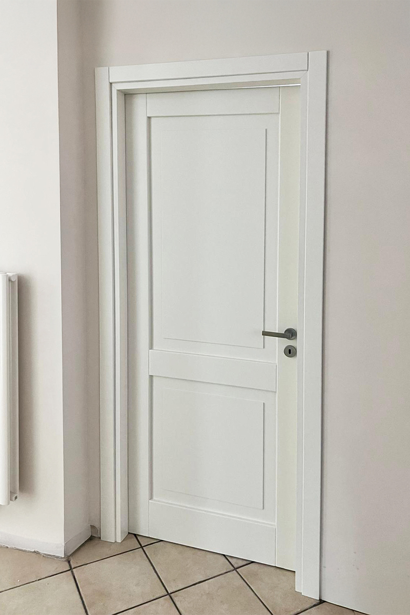 Il telaio è lineare e squadrato, con coprifili piatti che incorniciano la porta in modo sobrio, senza decorazioni eccessive.
