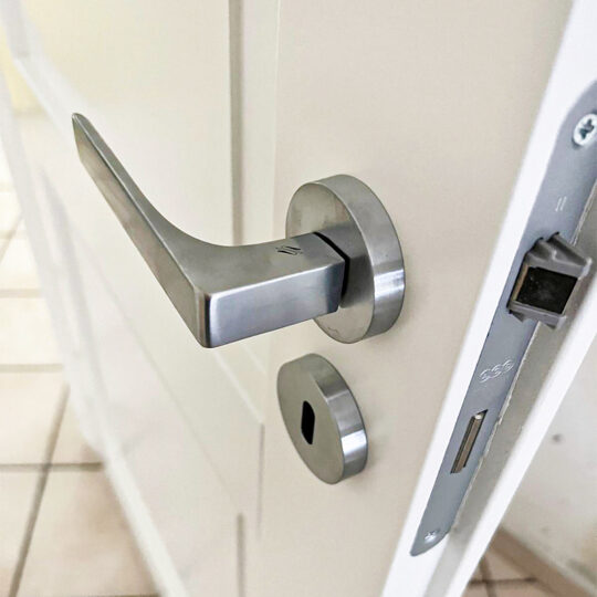 Porta a due pannelli bugnati. Presenta un pannello superiore più grande e uno inferiore più piccolo, separati da una traversa orizzontale all’altezza della maniglia. Questo stile è un classico intramontabile che si adatta bene sia ad ambienti tradizionali che contemporanei.