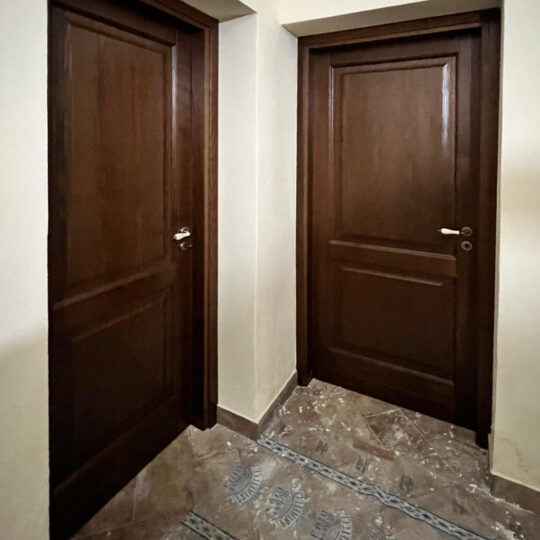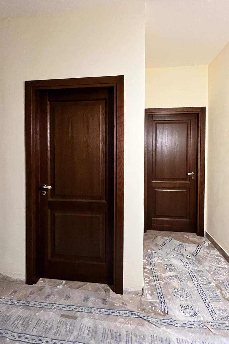 Si tratta di una porta a due specchiature (bugnata). Presenta un pannello superiore più grande e uno inferiore più piccolo, entrambi incorniciati da modanature che aggiungono profondità e un tocco tradizionale.