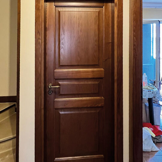 Porta interna in frassino tinto, un esempio perfetto di come il legno massiccio possa conferire calore e un senso di solida eleganza a un ambiente domestico.