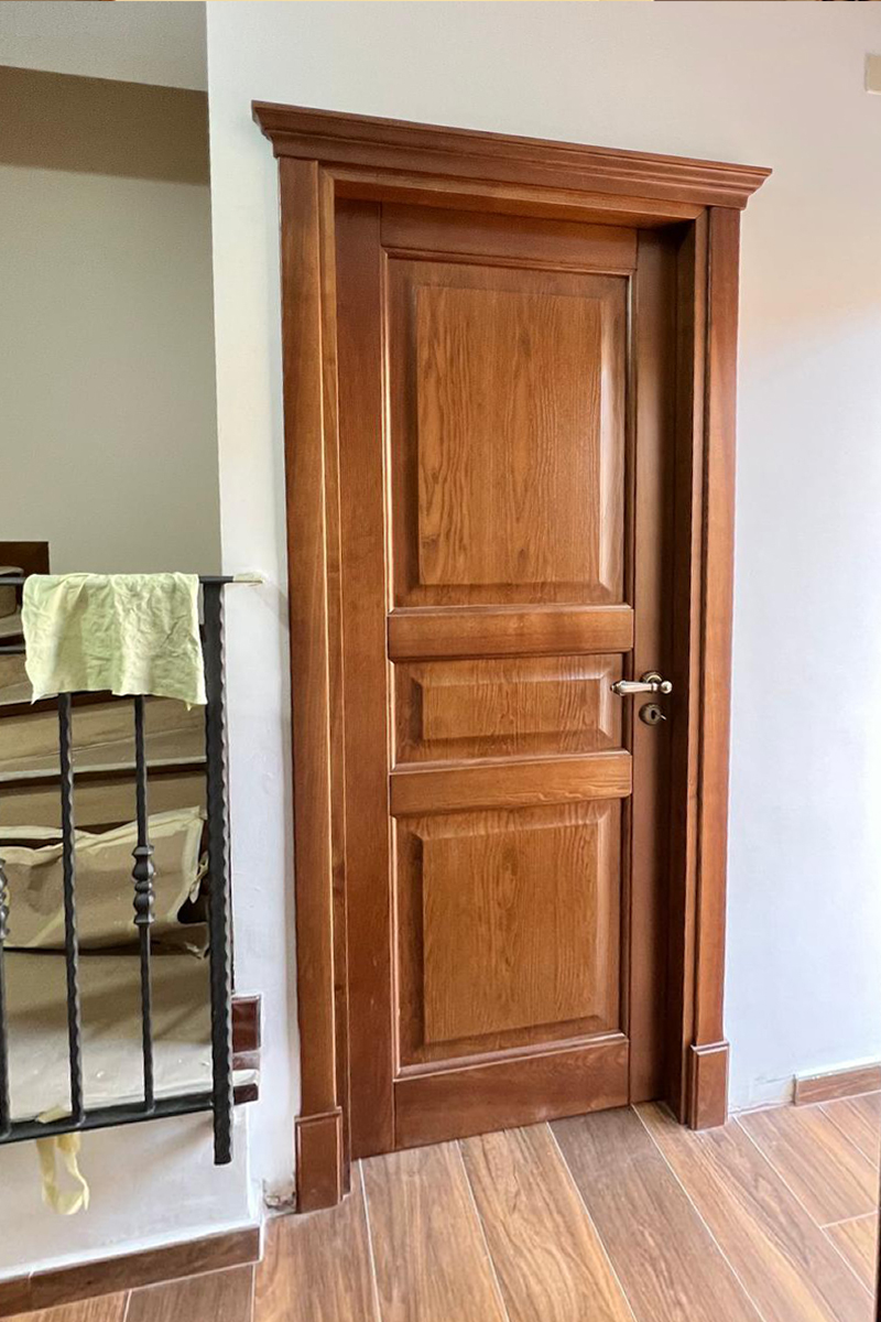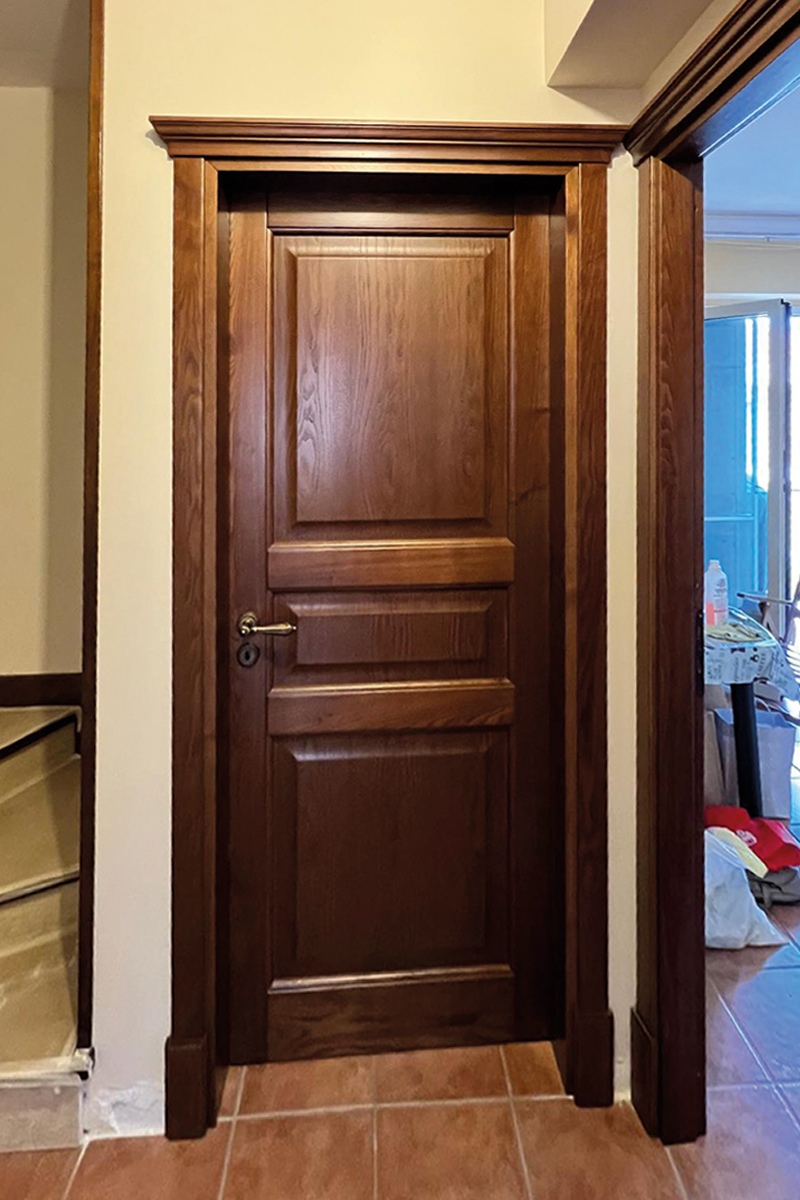 Una porta che celebra la tradizione del legno, impreziosita da lavorazioni classiche che non passano mai di moda.