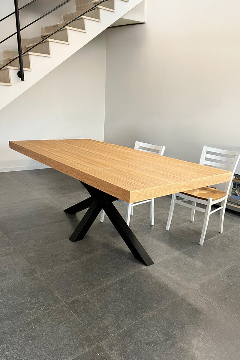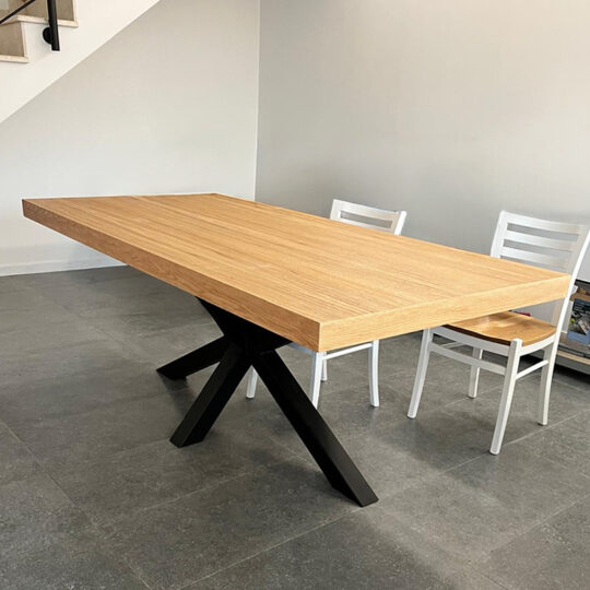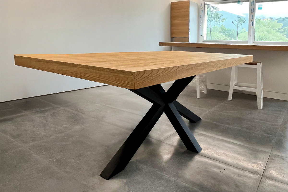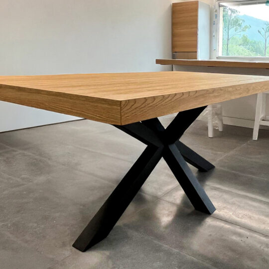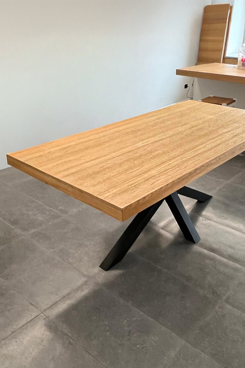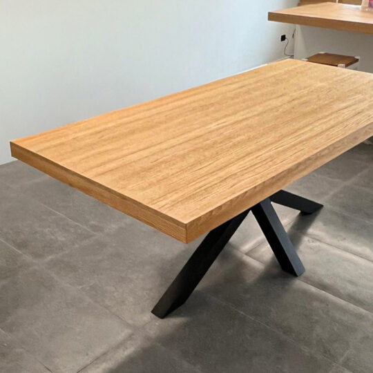 È un pezzo d’arredamento versatile: il piano in legno “scalda” l’ambiente, mentre la base metallica scura richiama i loft urbani e lo stile moderno. È ideale sia come tavolo da pranzo importante che come scrivania direzionale in un ufficio creativo.
